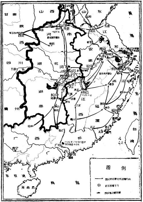 1924-1927年中国共产党和中国国民党合作进行的反对帝国主义、反对封建主义的伟大国内革命战争。1923年6月召开的中国共产党第三次全国代表大会,确定了与孙中山领导的中国国民党合作以建立革命统一战线的方针。1924年1月,在中国共产党的帮助下,孙中山召集了有共产党人参加的国民党第一次全国代表大会,改组了国民党,确定了联俄、联共、扶助农工的三大政策,把旧三民主义重新解释为革命的新三民主义。国共合作后,创办了由共产党参加领导的黄埔军官学校,组织了革命军队。1925年在共产党人领导下先后爆发了五卅运动和省港大罢工,全国掀起了群众性的反帝高潮。在革命运动不断高涨的形势下,国民革命军依靠工农群众的支持,胜利地进行了东征和南征,肃清了广东境内的军阀势力,统一和巩固了广东革命根据地。1926年1月召开的国民党第二次代表大会确定了北伐的方针,同时中国共产党也提出了出兵北伐推翻军阀统治的政治主张,受到广大群众的热烈拥护。同年5月,中国共产党直接领导下的叶挺独立团,作为北伐军的先遣队,向湖南挺进。7月初,广东国民政府发布《北伐宣言》。7月9日,国民革命军正式出师北伐。当时北伐军面临的敌人,一是军阀吴佩孚的军队约十余万人,集中于湖南、湖北一带;二是军阀孙传芳的军队约十余万人,盘踞江西、福建、安徽、浙江、江苏五省。北伐军共八个军,约十万人,先后分三路向北进攻。第一路由第四、第七、第八军进攻湖南、湖北。在第四军中,以共产党员为骨干的叶挺独立团英勇善战,于6月初克复攸县,随后协同其他各部于7月占领长沙,8月在湖北咸宁汀泗桥、贺胜桥两次战役中,击溃军阀吴佩孚主力,10月10日攻占武昌。第二路由第二、第三、第六军进攻江西,于11月占领南昌、九江,消灭了军阀孙传芳的主力。第三路由第一军向福建、浙江进军,因敌人内部分化,于12月占领闽、浙两省。在北伐战争中,中国共产党组织并发动广大工农群众给北伐军以积极的支援和配合。1927年春,汉口、九江工人驱逐英帝国主义者,收回两地的英租界,上海工人举行武装起义占领了上海。以湖南为中心的全国农民运动也猛烈开展起来。北伐战争的迅速推进,军阀吴佩孚、孙传芳的崩溃和工农运动的开展,极大地动摇了帝国主义在中国的统治。面对这一形势,为了阻挡中国革命的发展,帝国主义加紧了对中国革命的干涉,一方面直接出兵镇压,增兵上海,炮击南京;一方面分化瓦解革命阵营,并从其内部寻找新的代理人。当时,以蒋介石为代表的国民党右派适应了帝国主义的这一需要,并加紧与帝国主义相勾结,积极准备叛变革命。而中国共产党内以陈独秀为代表的右倾思想,发展成为右倾投降主义,并于1927年初在党的领导机关中占了统治地位。他们拒绝党内的正确主张,放弃无产阶级的领导权,对国民党右派的反革命行动采取妥协退让政策,压制和阻挠工农群众运动的发展,并在革命的紧要关头交出了革命武装。1927年4月12日和7月15日,蒋介石、汪精卫先后在上海、武汉发动反革命政变,残酷屠杀共产党人和革命人民,致使轰轰烈烈的第一次国内革命战争遭到失败。