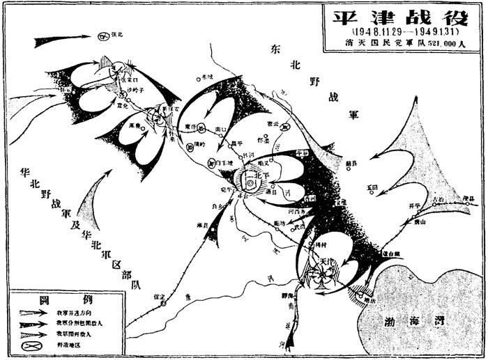 第三次国内革命战争时期,中国人民解放军东北、华北战军在北平(今北京)、天津、张家口地区对国民党军进行的一次重大战役。辽沈战役结束后,在北平、天津、张家口地区的国民党军共六十余万人,为解放军在各个战场上的胜利所震惊,急忙收缩兵力企图海运南逃或西窜绥远(今属内蒙古自治区)。为了稳住平津之敌,不使其逃跑,中共中央和毛泽东指示东北野战军早日秘密入关(山海关),首先包围天津、塘沽、芦台、唐山诸点之敌,以待部署完成之后各个歼灭。但东北野战军主要负责人林彪拒不执行。在中共中央和毛泽东纠正了林彪的右倾错误以后,东北野战军和华北野战军的两个兵团及地方部队共一百万人,按照中央的战略部署,在广大人民支援下,于1948年12月5日发起平津战役。解放军以神速的动作截断了敌军西窜或南逃的通路,将敌分割包围于北平、天津、张家口、新保安、塘沽五个据点。12月22日,围歼了新保安之敌第三十五军军部和两个师。24日,攻克了张家口,全歼守敌第十一兵团所属的一个军部又七个师。1949年1月14日,包围天津的解放军,在守敌指挥官陈长捷拒绝放下武器后,发起总攻,经二十九小时激战,全歼守敌十三万余人,生俘陈长捷,解放天津。至此,北平二十余万守敌,完全陷于绝境,经过解放军努力争取,在国民党华北“剿总”总司令傅作义率领下接受和平改编,1月31日北平宣告和平解放,整个平津战役即胜利结束。此役除塘沽守敌五万余人由海上逃跑外,共歼灭和改编了国民党军五十二万余人,基本上解放了华北地区。平津战役是解放战争中三个有决定意义的重大战役中的最后一个战役,解放军的胜利,在国内外产生了巨大的影响。