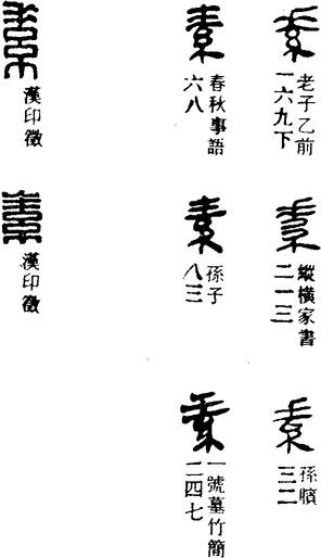 从上到下依次是小篆、甲骨文、金文、古玺及战国文字、缪篆及汉代文字、鸟虫篆。