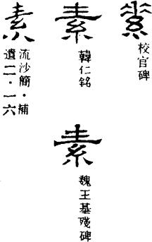 ①未经染色的生绢。《孟子·滕文公上》:“冠素。”《淮南子·齐俗》:“夫素之质白,染之以湼则黑。”(湼niè:黑泥。)泛指未经染色的,白色的。《吕氏春秋·情欲》:“墨子见染素丝者而叹。”司马相如《美人赋》:“素雪飘零。”又特指丧服的颜色。《左传·僖公三十三年》:“秦伯素服郊次。”(次:临时驻扎。)[尺素]古时用素绢书写,因而用来代指书信。张九龄《当涂界寄裴宣州》:“委曲风波事,难为素素传。”②质朴,不加修饰。《吕氏春秋·知度》:“不雕其素。”《淮南子·齐俗》:“遗形去智,抱素反真。”③空,白白地。《诗经·魏风·伐檀》:“彼君子兮,不素餐兮。”《左传·定公十二年》:“与其素厉,宁为无勇。”(素厉:空有勇猛之名。)今成语有“尸位素餐”。④蔬果类食品。《管子·禁藏》:“果蓏素食当十石。”(蓏luǒ:瓜。)后指无肉的食品。《汉书·霍光传》:“居道上,不素食。”⑤诚心,真情。后来写作“愫”。《战国策·秦策三》:“竭智能,示情素。”⑥平素,向来。司马迁《报任安书》:“夫仆与李陵俱居门下,素非能相善也。”《世说新语·识鉴》:“二人素善,遂十余日方还。”今成语有“我行我素”、“素昧平生”。