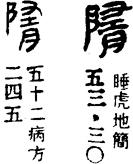 ㈡suí ⑤周代诸侯国名。本作“随”,古籍中也写作“隋”。《淮南子·览冥》:“譬如隋侯之珠,和氏之璧,得之者富,失之者贫。”(隋侯之珠:相传隋国国君所得的宝珠。)⑥朝代名(公元581—618年)。杨坚灭北周称帝,国号为“隋”。