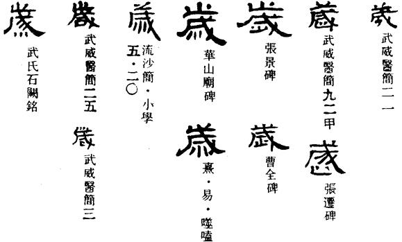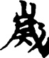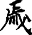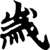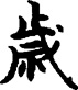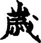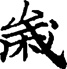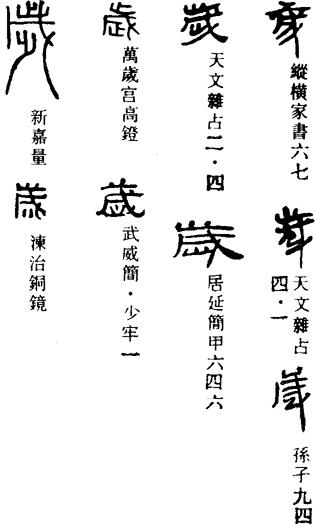 甲骨文和早期金文中的岁字,象一把长柄斧钺之形,其上下两点即表示斧刃上下尾端回曲中之透空处。岁的本义是一种斧钺,借用为年岁之岁,泛指时间、光阴,所以金文岁字增加两个止形(即步字),表示日月变更、时光流逝的意思。