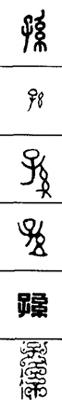 从上到下依次是小篆、甲骨文、金文、古玺及战国文字、缪篆及汉代文字、鸟虫篆。