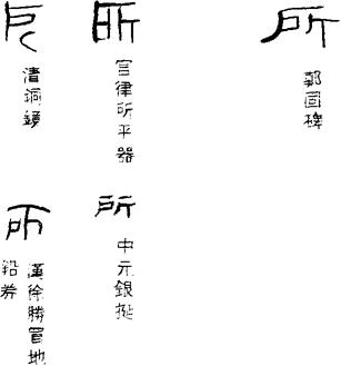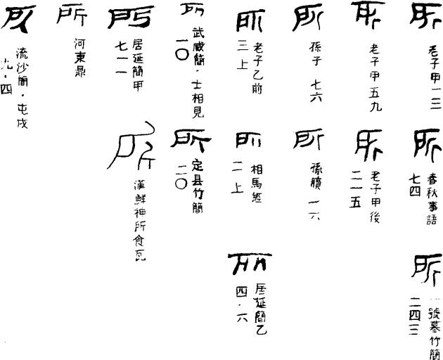 《说文》:“所,伐木声也,从斤,户声。”段注:“伐木声,乃此字本义。用为处所者,假借为处字也。”