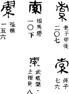 从上到下依次是小篆、甲骨文、金文、古玺及战国文字、缪篆及汉代文字、鸟虫篆。