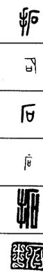 从上到下依次是小篆、甲骨文、金文、古玺及战国文字、缪篆及汉代文字、鸟虫篆。