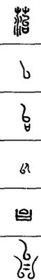 从上到下依次是小篆、甲骨文、金文、古玺及战国文字、缪篆及汉代文字、鸟虫篆。