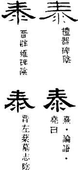 〈辨〉泰字篆书从廾从水、大声,本义为滑,双手掬水,自然会从缝中流下;借用为义项①。楷书讹变作泰。