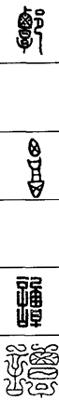 从上到下依次是小篆、甲骨文、金文、古玺及战国文字、缪篆及汉代文字、鸟虫篆。