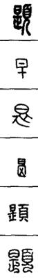 从上到下依次是小篆、甲骨文、金文、古玺及战国文字、缪篆及汉代文字、鸟虫篆。