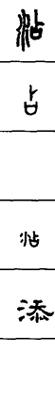 〈辨〉添字篆书作沾。沾,从水占声,一读zhān,本义为古河流名,淇水支流,源出山西,流入河南;一读tiān,义为增加。后造添字,仍沿用水为形符,改用忝为声符◇注意:添字右上部作天,不要误写成夭。