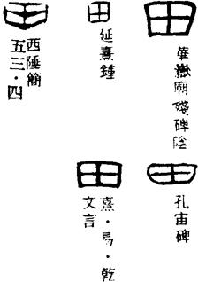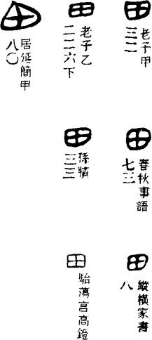【说明】“田”为象形字,像田地中有纵横交错的阡陌或沟渠之形。参附录三。