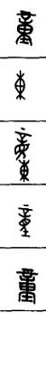 从上到下依次是小篆、甲骨文、金文、古玺及战国文字、缪篆及汉代文字、鸟虫篆。