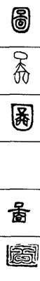 从上到下依次是小篆、甲骨文、金文、古玺及战国文字、缪篆及汉代文字、鸟虫篆。