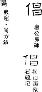 倡音chāng。倡的本义是古代表演歌舞的乐人。《说文》:“倡,乐也。”《广韵》:“倡,优也。”(优,演戏的人。)倡又有妓女义。《艺文类聚》卷三十一引梁元帝《荡子秋思赋》:“况乃倡楼荡妇,对此伤情。”(何况她就是个娼楼放荡的妓女,对此感情还如此哀伤。)白行简《李娃传》:“汧(qiān)国夫人李娃,长安之倡女也。”(汧国夫人李娃,本是京都长安的妓女。汧国,指唐代汧阳郡,治所在今陕西汧阳县西。)又:“嗟乎,倡荡之姬,节行如此,虽古先烈女,不能逾也。”(唉,李娃曾是娼门放荡的妓女,却有这样高贵奇特的品行,即使古代的烈女也不会超过她。)按:宋、元人有“倡条冶叶”一词,本指草木柔嫩美艳的枝叶,亦可借称妓女。“妓女”义,后来更换义符写作“娼”。