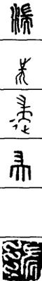 从上到下依次是小篆、甲骨文、金文、古玺及战国文字、缪篆及汉代文字、鸟虫篆。