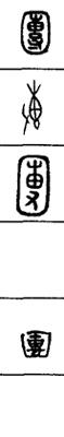从上到下依次是小篆、甲骨文、金文、古玺及战国文字、缪篆及汉代文字、鸟虫篆。
