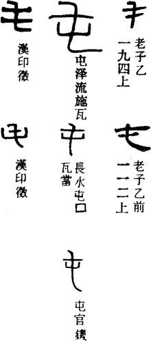甲骨文、金文的屯字,象一颗植物种子刚刚发出来的小嫩芽,上面的圆圈(或圆点)是种子还未脱去的皮壳,所以屯字的本义当指草木初生的嫩芽。草木初生,需要破土脱壳,十分艰难,故屯字又有“艰难”之义。此外,屯又可读为tún,有聚集、驻守等义,如屯聚,屯戍(聚集兵力,驻守边防)、屯兵(驻兵,又专指驻守边疆、从事垦荒的军队)。