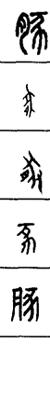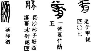 从上到下依次是小篆、甲骨文、金文、古玺及战国文字、缪篆及汉代文字、鸟虫篆。