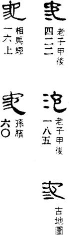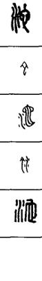 从上到下依次是小篆、甲骨文、金文、古玺及战国文字、缪篆及汉代文字、鸟虫篆。