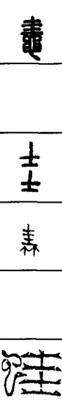 从上到下依次是小篆、甲骨文、金文、古玺及战国文字、缪篆及汉代文字、鸟虫篆。