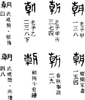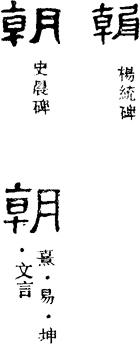 朝本是一个会意字。金文朝字,一边是一条河流的形状,另一边上下是草木、中间是日,象早晨的太阳从河边的草木间慢慢升起,正是一幅河边看日出的图景。它的本义即指早晨。小篆以后,朝字的字形一再发生讹变,原来字形的会意荡然无存。