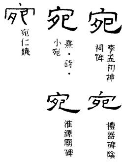 〈辨〉宛字从宀,本义指宫室深曲之状,泛指曲折。声符夗,读yuàn。