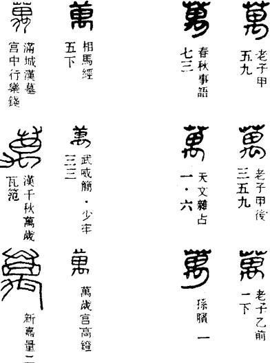 甲骨文的万字,象一个巨螯屈尾的蝎子形状,其本义是指蝎子。此字后来借用为数词,十百为千,十千为万;又极言其多,如万物、万象等;又引申为极其、非常、绝对等义,如万全、万无一失等。
