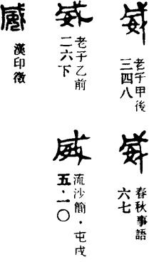 ①威严,有威仪。《论语·述而》:“子温而厉,威而不猛,恭而安。”引申为威力,威势。《吕氏春秋·慎大》:“干辛任威,凌轹诸侯。”《韩非子·说疑》:“则威足以临天下。”②威慑,使恐惧。《孟子·公孙丑下》:“威天下不以兵革之利。”《吕氏春秋·用民》:“虽造父之所以威马也,不过此也。”③惧怕,敬畏。《左传·庄公二十八年》:“宗邑无主,则民不威。”《庄子·渔父》:“未尝见夫子遇人如此其威也。”