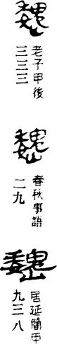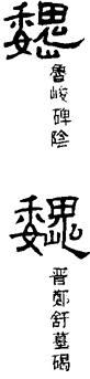 〈辨〉巍字从嵬;嵬读wéi,从山鬼声,义为山势雄伟高大。魏为巍字简化形式,后来区别为二字,魏读wèi,用为古国名、朝代名,详魏字下。