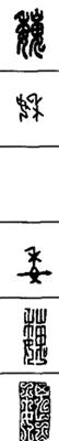 从上到下依次是小篆、甲骨文、金文、古玺及战国文字、缪篆及汉代文字、鸟虫篆。