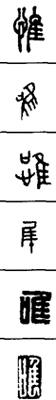 从上到下依次是小篆、甲骨文、金文、古玺及战国文字、缪篆及汉代文字、鸟虫篆。