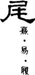㈠wěi ①尾巴。②事物的末后部分。如:船尾。③在后面。如:尾随。④底。《尔雅·释水》:“瀵,大出尾下。”⑤鸟兽虫鱼交配。《书·尧典》:“鸟兽孳尾。”⑥鱼的计数词。如:一尾鱼。⑦星名,二十八宿之一。亦称“天鸡”、“析木”。⑧姓。后汉有尾敦。