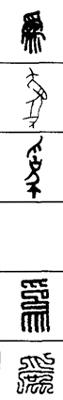 从上到下依次是小篆、甲骨文、金文、古玺及战国文字、缪篆及汉代文字、鸟虫篆。