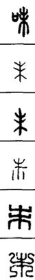 从上到下依次是小篆、甲骨文、金文、古玺及战国文字、缪篆及汉代文字、鸟虫篆。