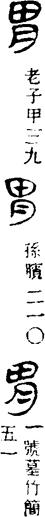 (播)也者,上直(德)受(授)臤(賢)之胃也。”郭店楚簡本《老子》甲簡七:“……是胃果而不剛(强)。”馬王堆帛書《老子》甲、乙本同,王弼本無“是胃”二字。上博楚竹書《魯邦大旱》簡一:“魯邦大旱,哀公胃孔子……”上博楚竹書《性情論》簡六:“凡見(現)者之胃勿(物),