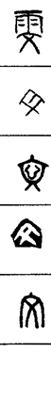 从上到下依次是小篆、甲骨文、金文、古玺及战国文字、缪篆及汉代文字、鸟虫篆。