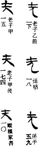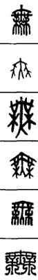 从上到下依次是小篆、甲骨文、金文、古玺及战国文字、缪篆及汉代文字、鸟虫篆。