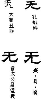 由甲骨文舞字讹变而成,读wǔ。楷书讹变作無。无为無字的六国古文中的奇字;当时人可能认为元字从一兀声,元为元气,阴阳未分,混而为一,所以形符从一,兀读wū;而无字在一和兀之间加一竖,表示上通于一,一为元气,也象征道,道贵虚无,所以用无为虚无字。其实,从古文字资料看,元、兀同字,都象示人的头,可是,当时人并不了解。今通用无。