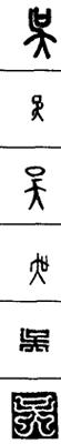 从上到下依次是小篆、甲骨文、金文、古玺及战国文字、缪篆及汉代文字、鸟虫篆。