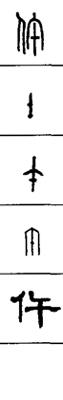 从上到下依次是小篆、甲骨文、金文、古玺及战国文字、缪篆及汉代文字、鸟虫篆。