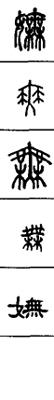 从上到下依次是小篆、甲骨文、金文、古玺及战国文字、缪篆及汉代文字、鸟虫篆。