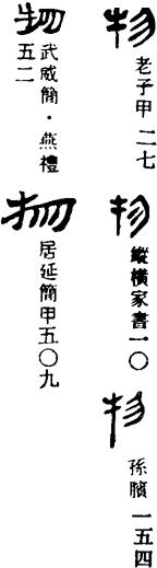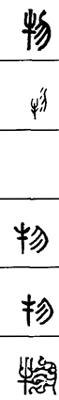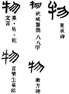 ①杂色牛。《诗经·小雅·无羊》:“三十维物,尔牲则具。”引申指杂色的旗。《周礼·春官·司常》:“通帛为旜,杂帛为物。”(旜zhān:纯赤色的曲柄旗。)又引申为颜色。《周礼·春官·保章氏》:“以五云之物,辨吉凶。”②东西,事物。《诗经·小雅·鱼丽》:“物其多矣,维其嘉矣。”又为与“我”相对的他物。范仲淹《岳阳楼记》:“不以物喜,不以己悲。”引申为事物的内容、实质。《周易·家人》:“君子以言有物而行有恒。”又引申为种类。《国语·晋语六》:“如草木之产也,各以其物。”③人,众人。《水经注·洛水》:“既神游自得,不与物交。”《老学庵笔记》卷五:“沿路作乐,固已骇物论。”④察看,选择。《左传·昭公三十二年》:“物土方,议远迩。”《周礼·地官·艸人》:“则物其地,图而授之。”⑤[物故]死亡。物通“歾”,死。《荀子·君道》:“则不能不有疾病物物之变焉。”