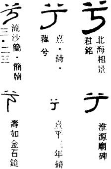 从上到下依次是小篆、甲骨文、金文、古玺及战国文字、缪篆及汉代文字、鸟虫篆。