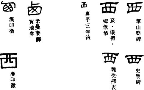 〈辨〉西字甲骨文有时作甾,以甾字形体象示鸟窝,甾读zī;有时作囟,借用为西,囟读xìn。金文仍以囟假借为西。篆书作鸟在巢上形,上部略象鸟,下部略象巢,日至西方而鸟栖,所以用为西方的西。楷书讹变作西。