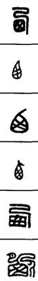从上到下依次是小篆、甲骨文、金文、古玺及战国文字、缪篆及汉代文字、鸟虫篆。