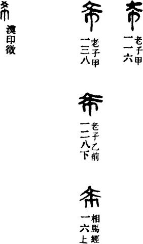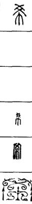 从上到下依次是小篆、甲骨文、金文、古玺及战国文字、缪篆及汉代文字、鸟虫篆。