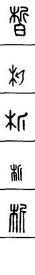 从上到下依次是小篆、甲骨文、金文、古玺及战国文字、缪篆及汉代文字、鸟虫篆。
