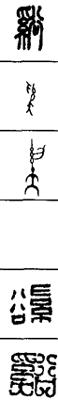 从上到下依次是小篆、甲骨文、金文、古玺及战国文字、缪篆及汉代文字、鸟虫篆。