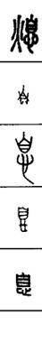 从上到下依次是小篆、甲骨文、金文、古玺及战国文字、缪篆及汉代文字、鸟虫篆。